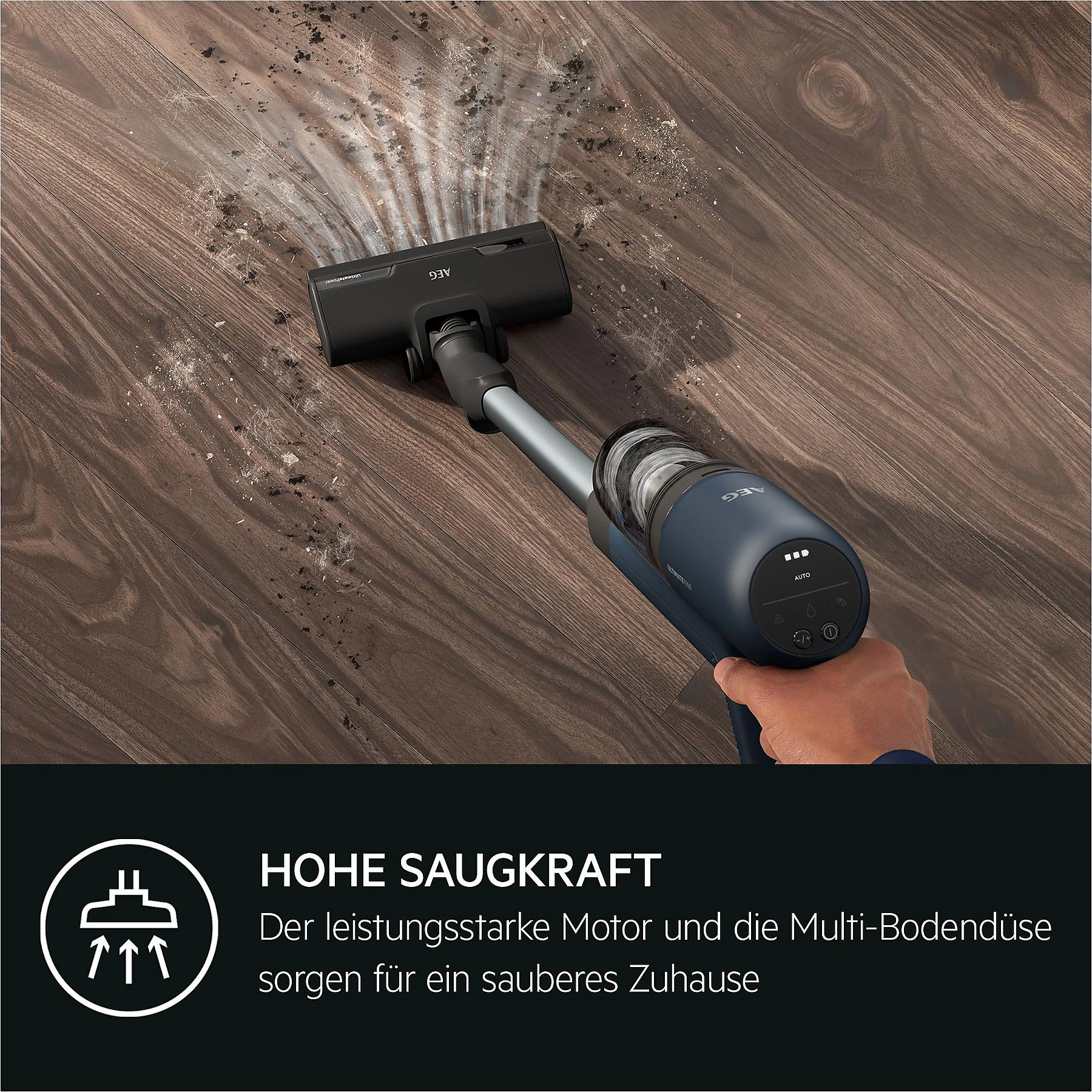 Der kompakte Power-Akku ermöglicht bis zu 50 Minuten Laufzeit mit dem Handteil bzw. bis zu 40 Minuten bei Verwendung der Bodendüse – ausreichend für die Reinigung von bis zu ca. 120 m² in einem Durchgang. Die UltimatePower Hartbodendüse nimmt Staub selbst aus Fugen zuverlässig auf, während das 5-stufige Filtersystem bis zu 99,99 % des Feinstaubs im Bereich von 0,3–10 µm zurückhält. Eine digitale Anzeige mit AUTO-Modus erleichtert die Bedienung, und nachhaltige Materialien mit bis zu 60 % Recyclingkunststoff schonen die Umwelt.