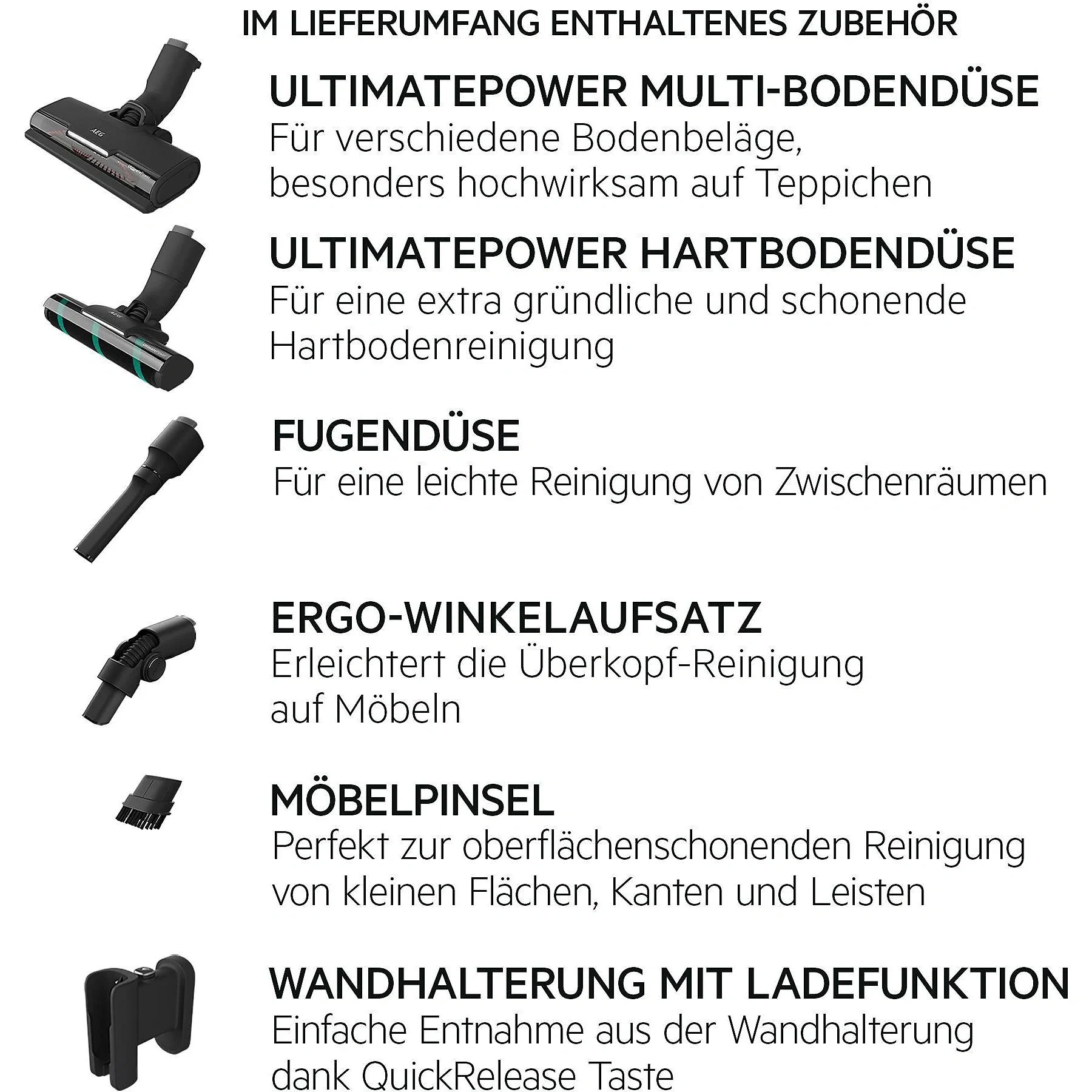 Düsen & Bürstenpflege | Die UltimatePower Multi-Bodendüse und Hartbodendüse regelmässig auf Fäden, Haare und Verschmutzungen prüfen. Verfangene Partikel gemäss Anleitung entfernen, um den Lauf der Bürsten und die Reinigungsleistung zu erhalten. LED-Leuchten mit einem weichen, trockenen Tuch reinigen und keine aggressiven Reinigungsmittel verwenden, um die Oberflächen nicht zu beschädigen. |