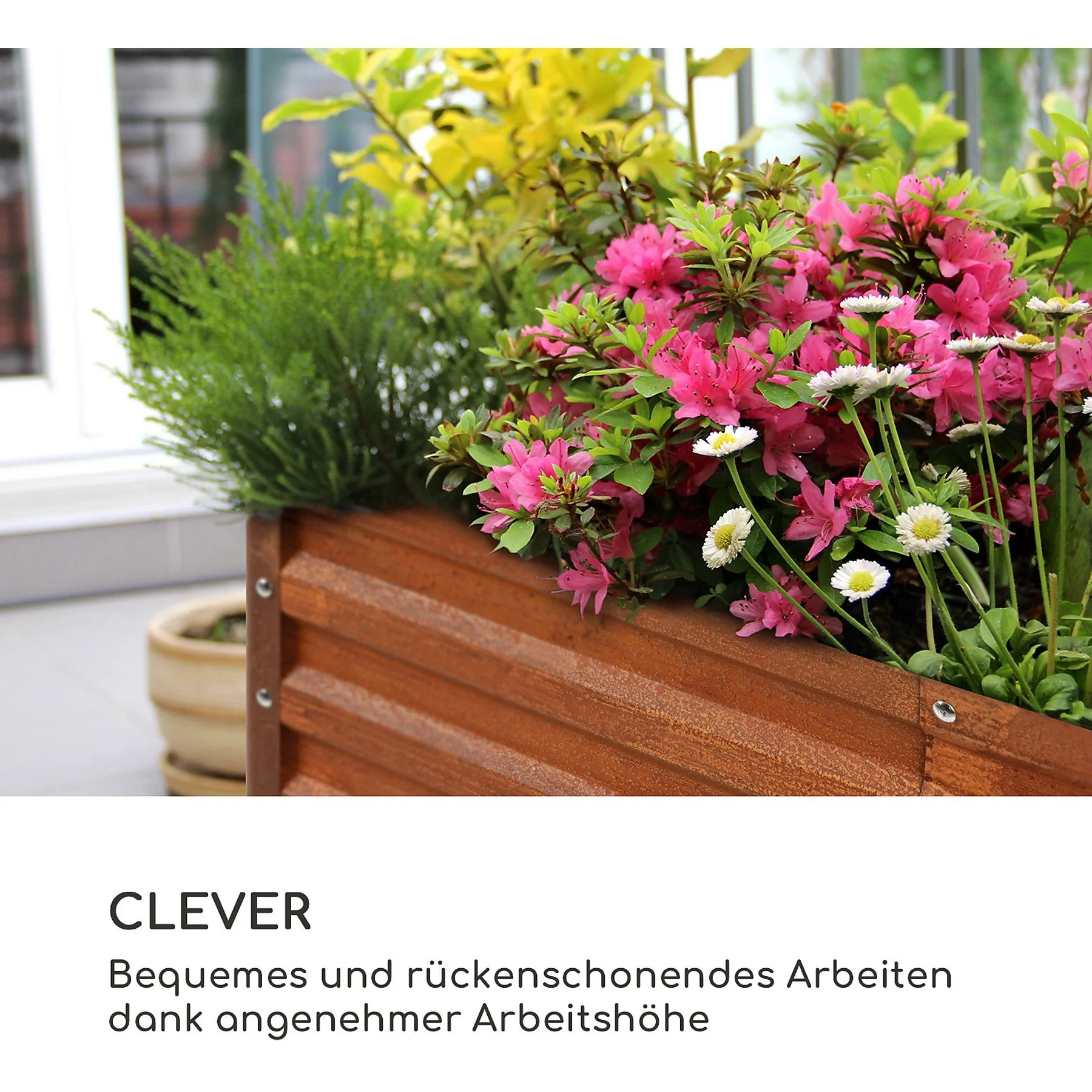 Highlights: Ideal für den eigenen Anbau von Gemüse und Kräutern, wetterfeste Konstruktion, erhöhte Bauweise schützt vor Schnecken, rückenschonendes Arbeiten, attraktives Rost-Finish.