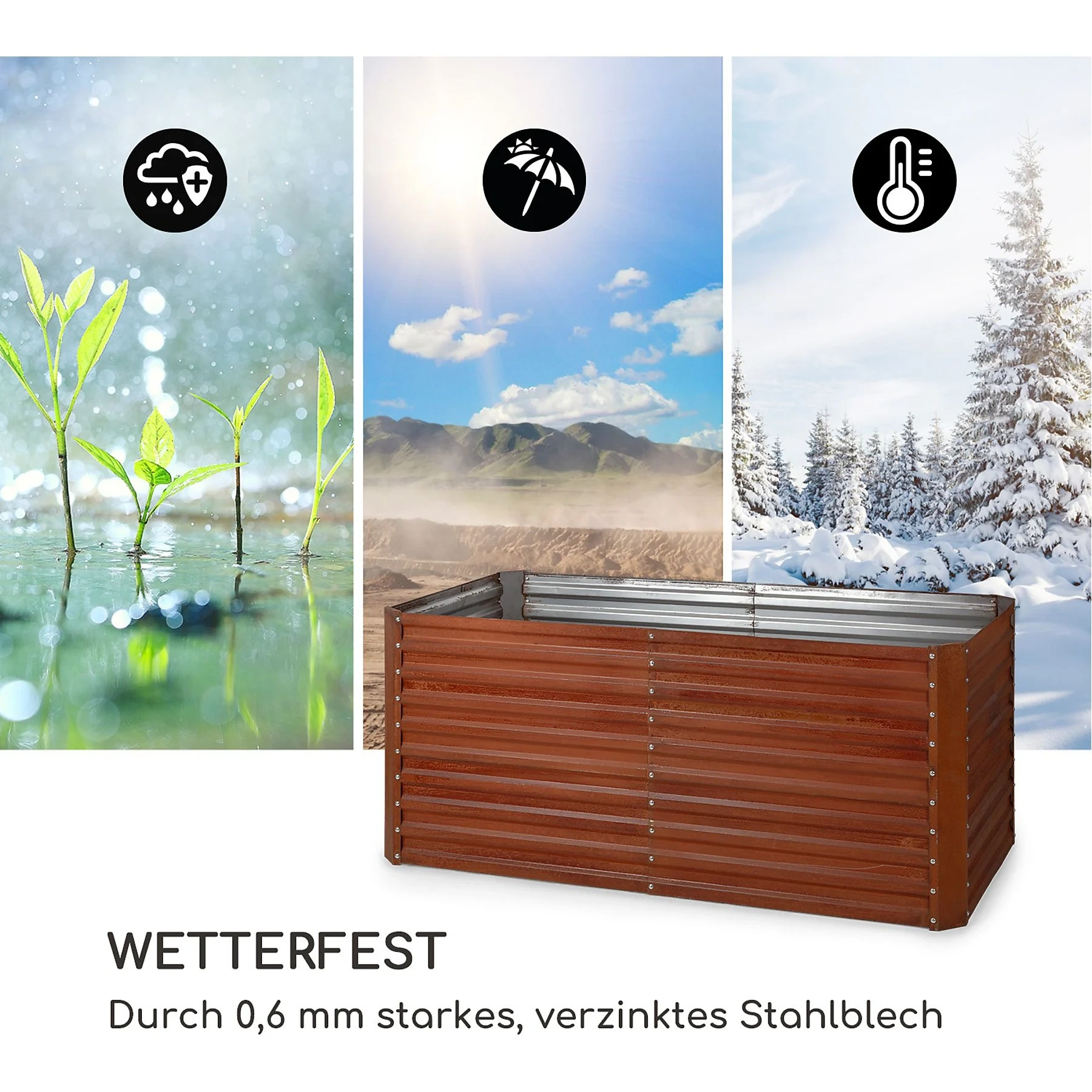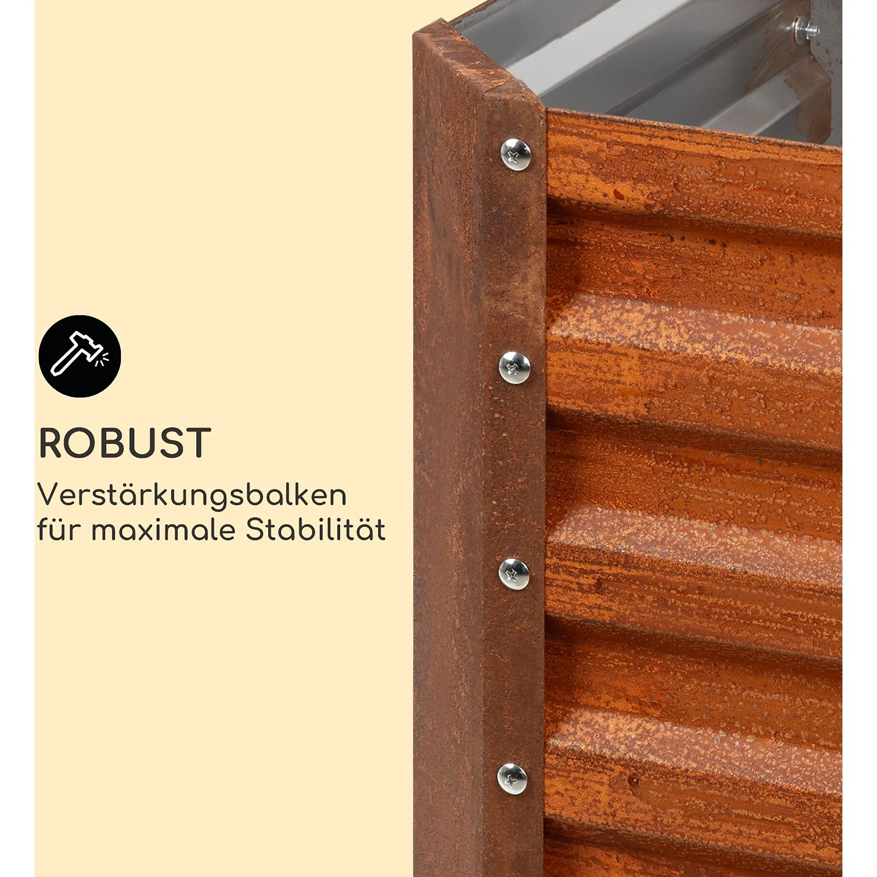 Der stabile Rahmen aus verzinktem Stahl-Wellblech trotzt Wind und Wetter das ganze Jahr über. Das edle Rost-Finish sorgt für ein stimmiges Gesamtbild und macht das Hochbeet zu einem attraktiven Blickfang in jedem Garten.