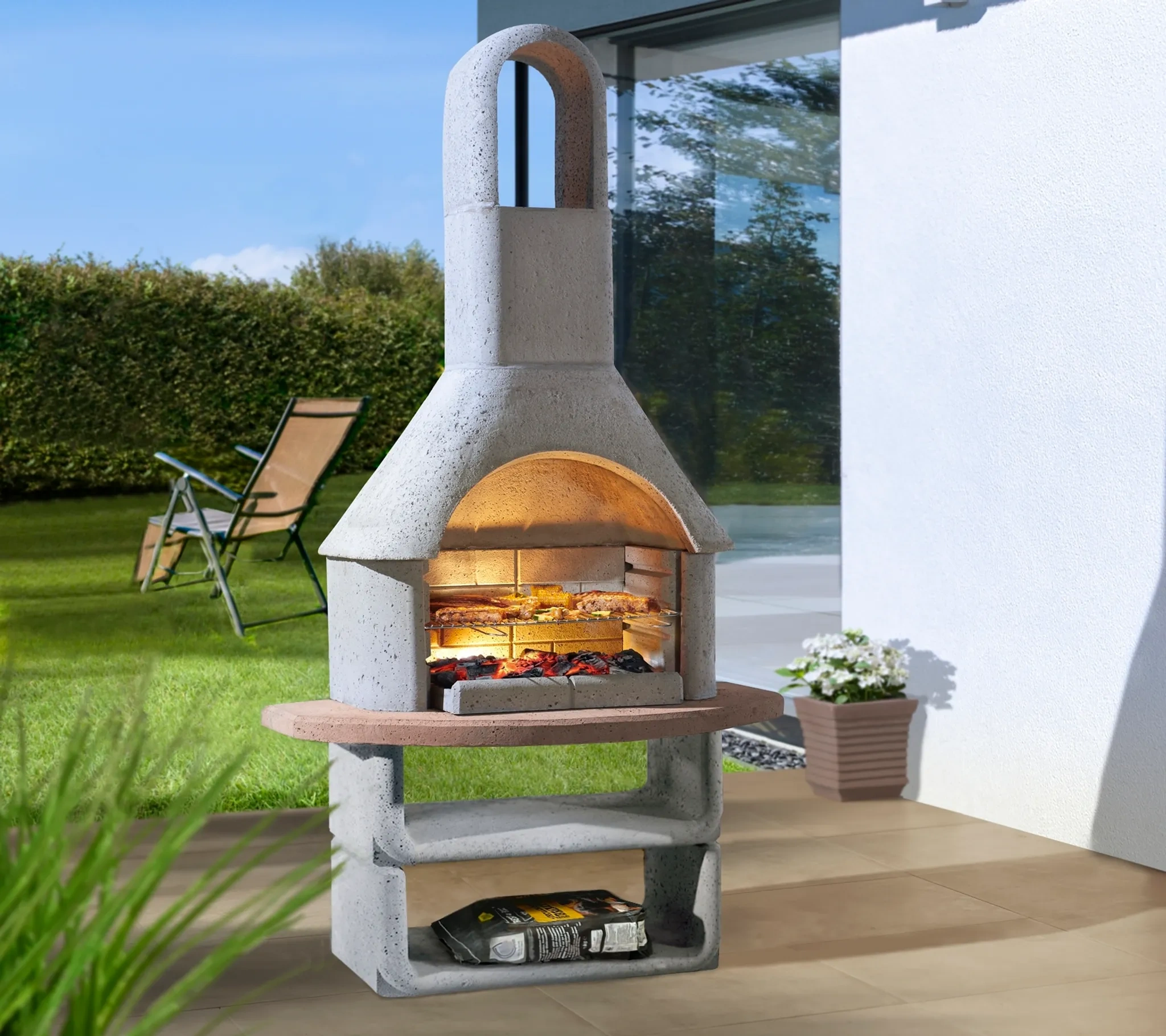 Highlights: Moderner Gartengrillkamin aus Beton, individuell gestaltbar durch Streichen oder Verputzen, ausgezeichnete Wärmespeicherung, einfache Montage mit Ansatzkleber, ideal für gesellige Abende im Freien.