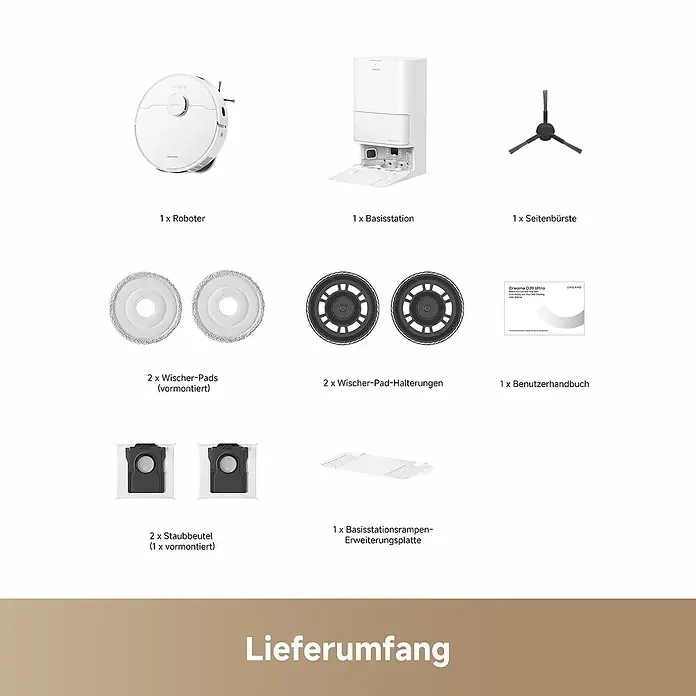 Im Paket | Dreame D20 Ultra Roboter, All-in-One PowerDock, DuoScrub Wisch-Pads, Wassertank, Bedienungsanleitung |