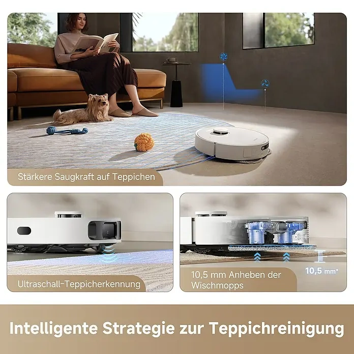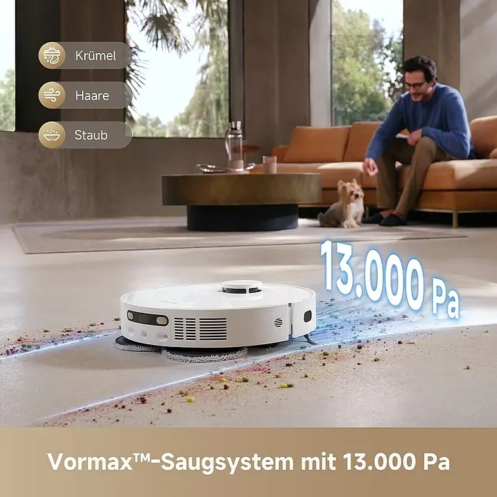 Highlights: 13.000 Pa Vormax-Saugsystem, DuoScrub Wisch-Pads, automatische Moppreinigung & Warmlufttrocknung, intelligente Teppicherkennung, lange Laufzeit bis 260 Minuten, präzise Kartierung und Routenplanung, kompatibel mit Sprachsteuerung.