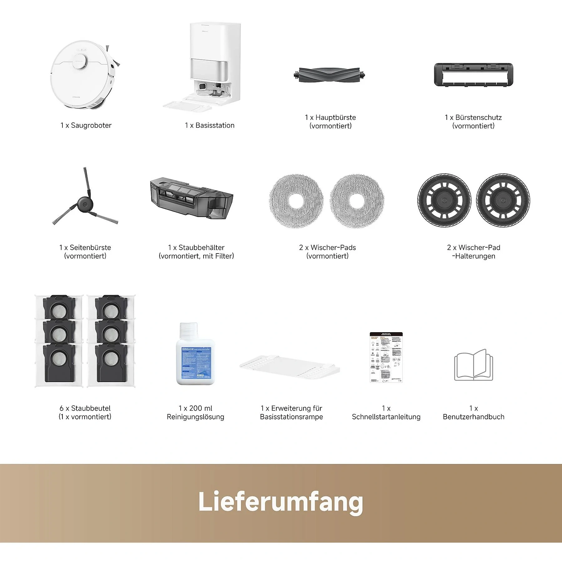 Im Paket | Dreame L10s Ultra Gen 3, 1 Seitenbürste, 2 Wischer-Pads (vorinstalliert), 2 Wischer-Pad-Halterungen, Basisstationsrampen-Erweiterungsplatte, 6 Staubbeutel (1x vorinstalliert), 200 ml Reinigungsflüssigkeit, Benutzerhandbuch |