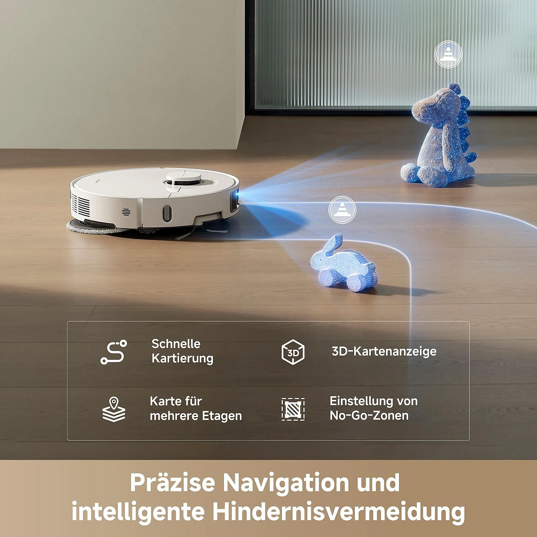 Navigation & Sensorik | Lasernavigation, Hinderniserkennung, virtuelle Wände, Raumerkennung, Oberflächensensor, Teppicherkennung, Schmutzsensor |