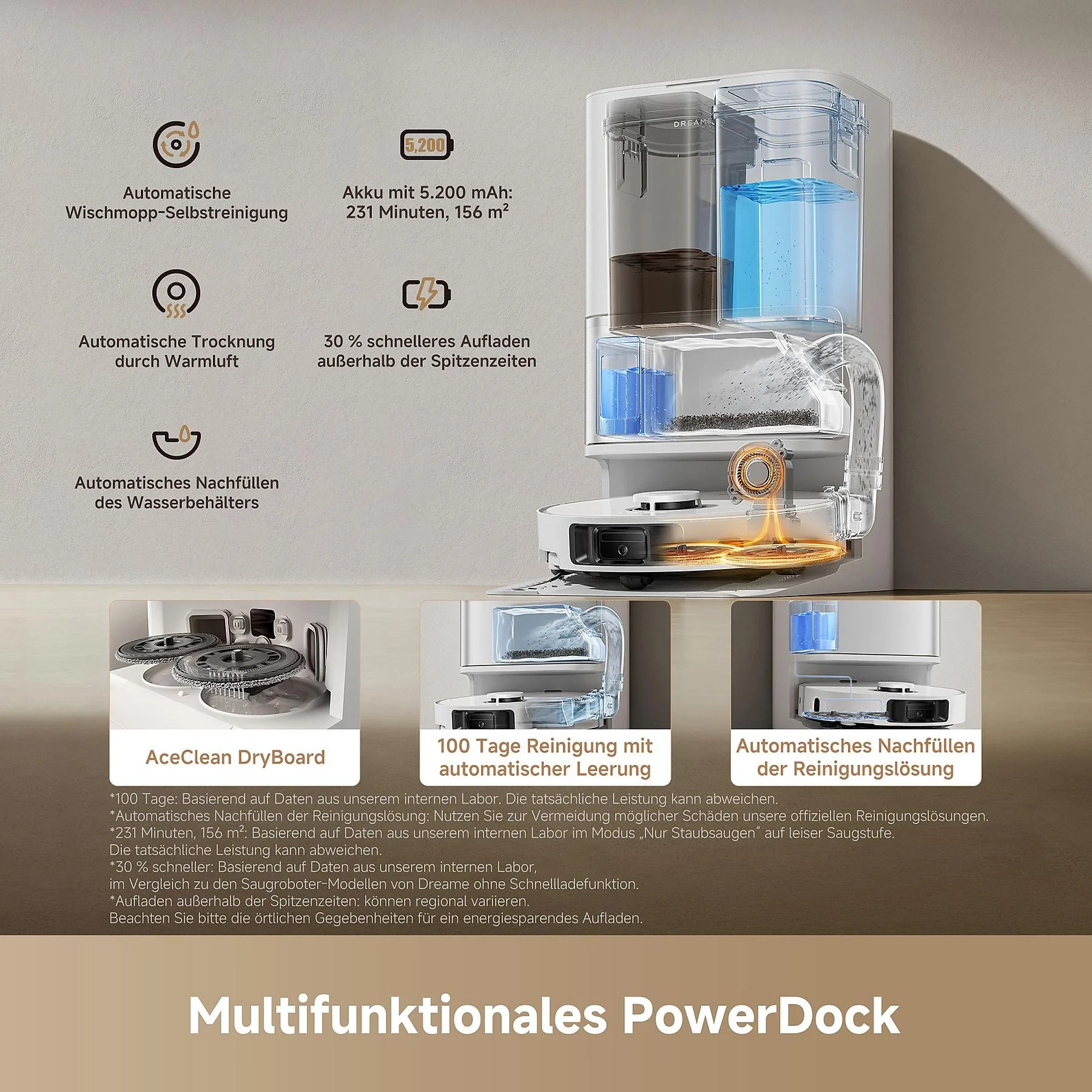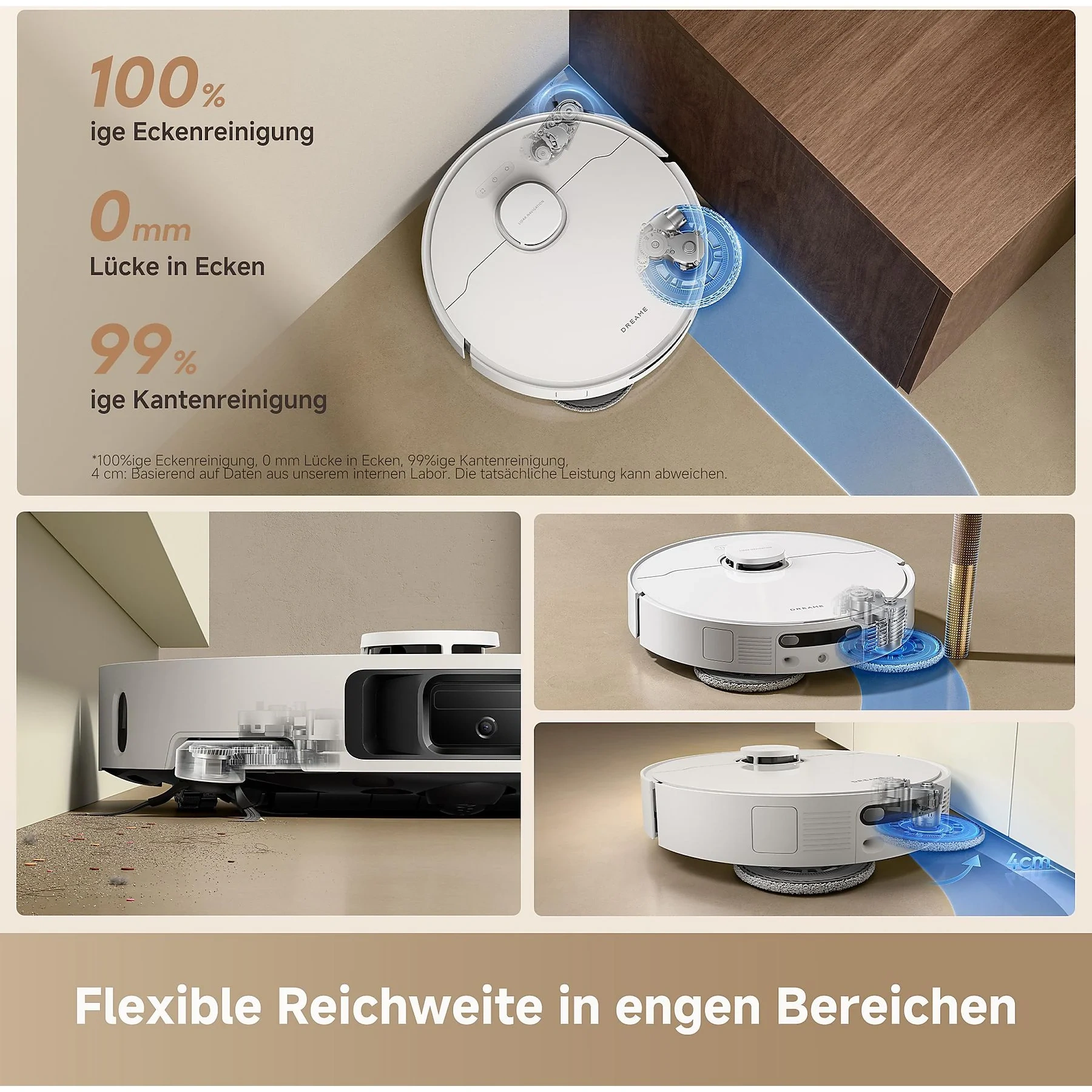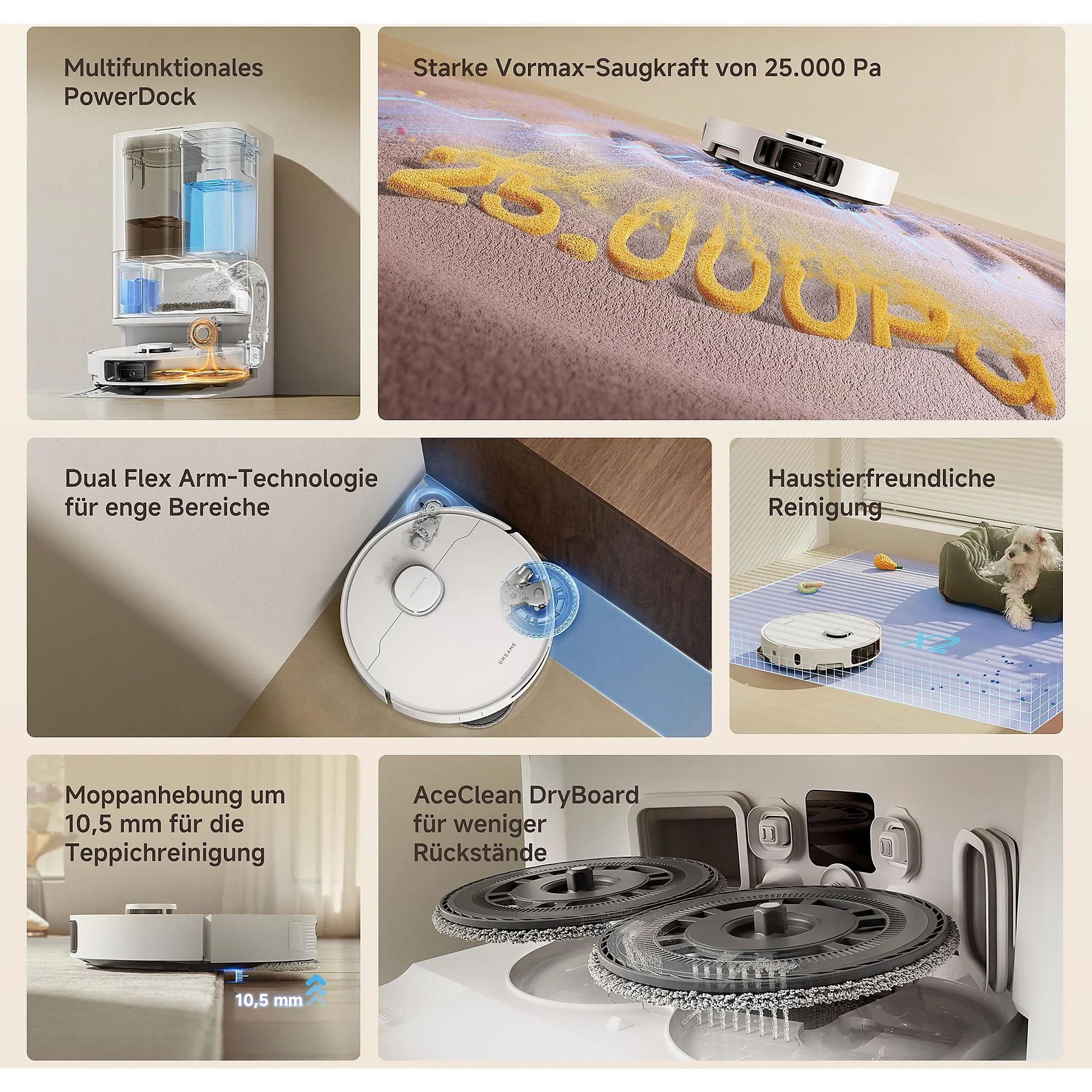 Highlights: Leistungsstarke 25.000 Pa Saugkraft, Dual-Flex-Arm-Technologie für Ecken und Kanten, All-in-One Basisstation mit automatischer Staubentleerung und Warmlufttrocknung, haustierfreundliche Reinigung, präzise Hinderniserkennung, kompatibel mit Sprachsteuerung.