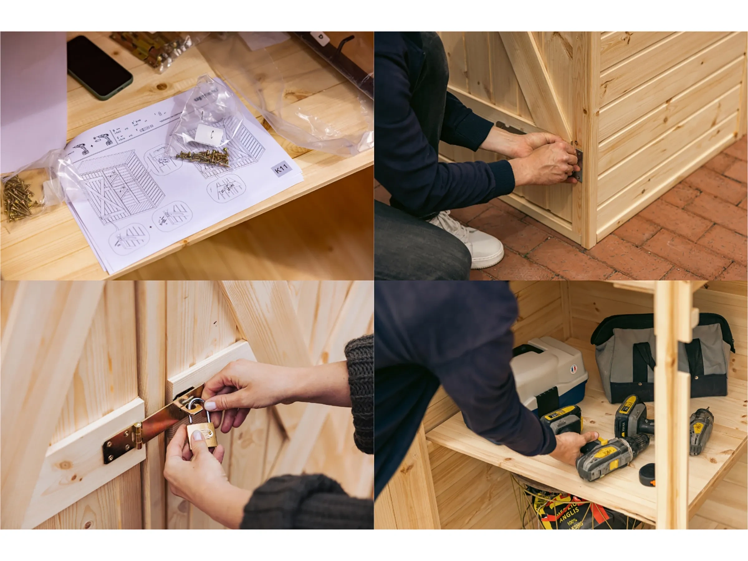 Im Paket | Modulare Wand- und Dachplatten, Bodenpanel, Doppeltüren mit Scharnieren, 2 Regale, 6 Haken, Schrauben & Montagematerial, Aufbauanleitung |