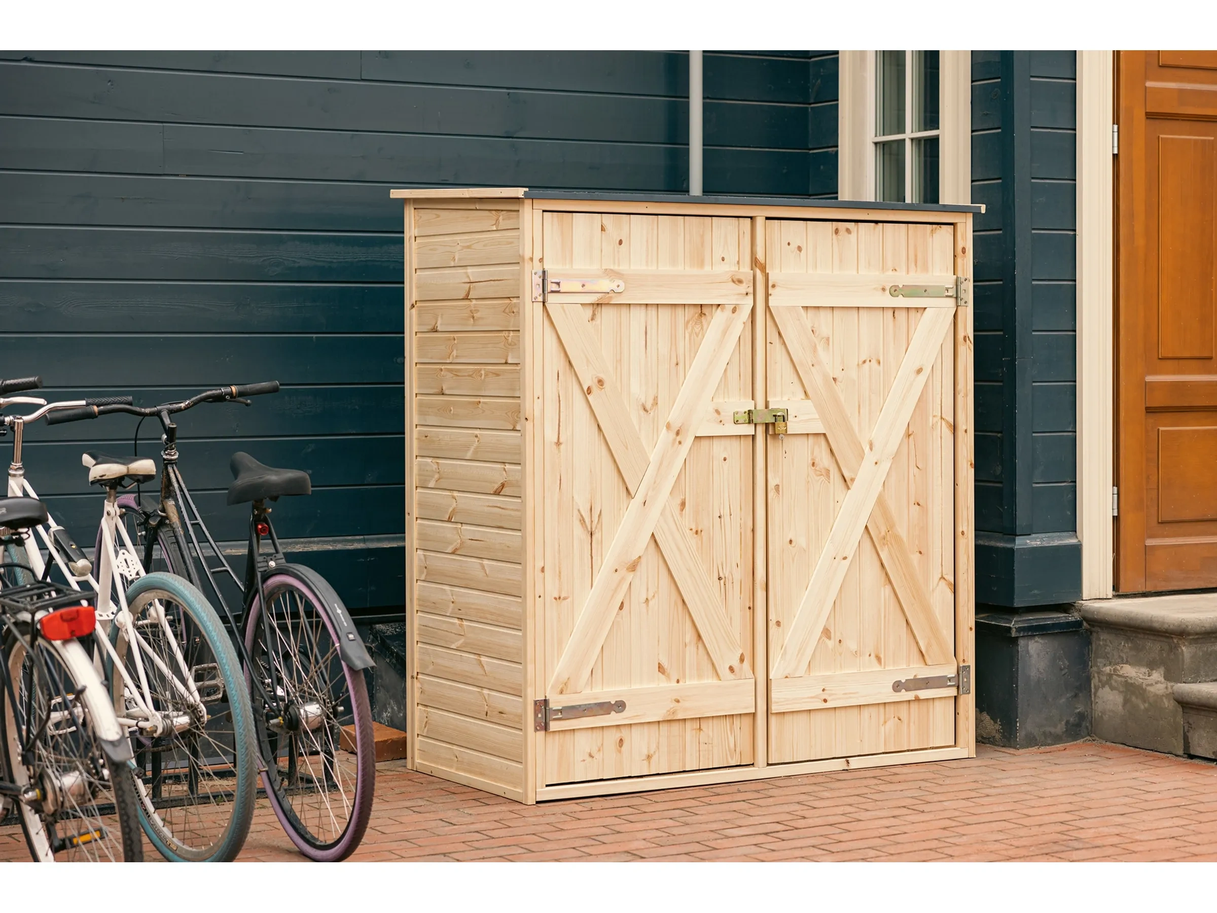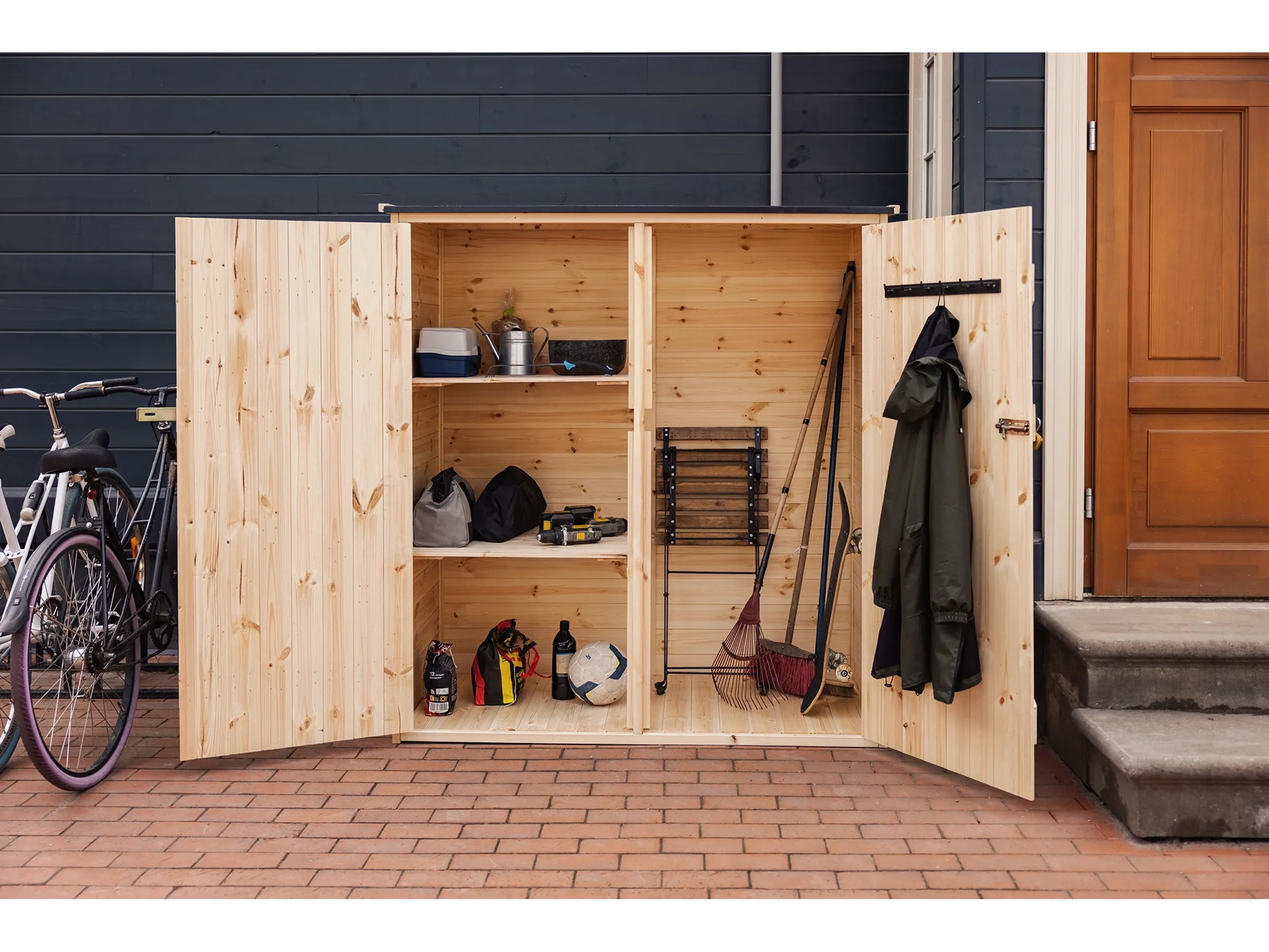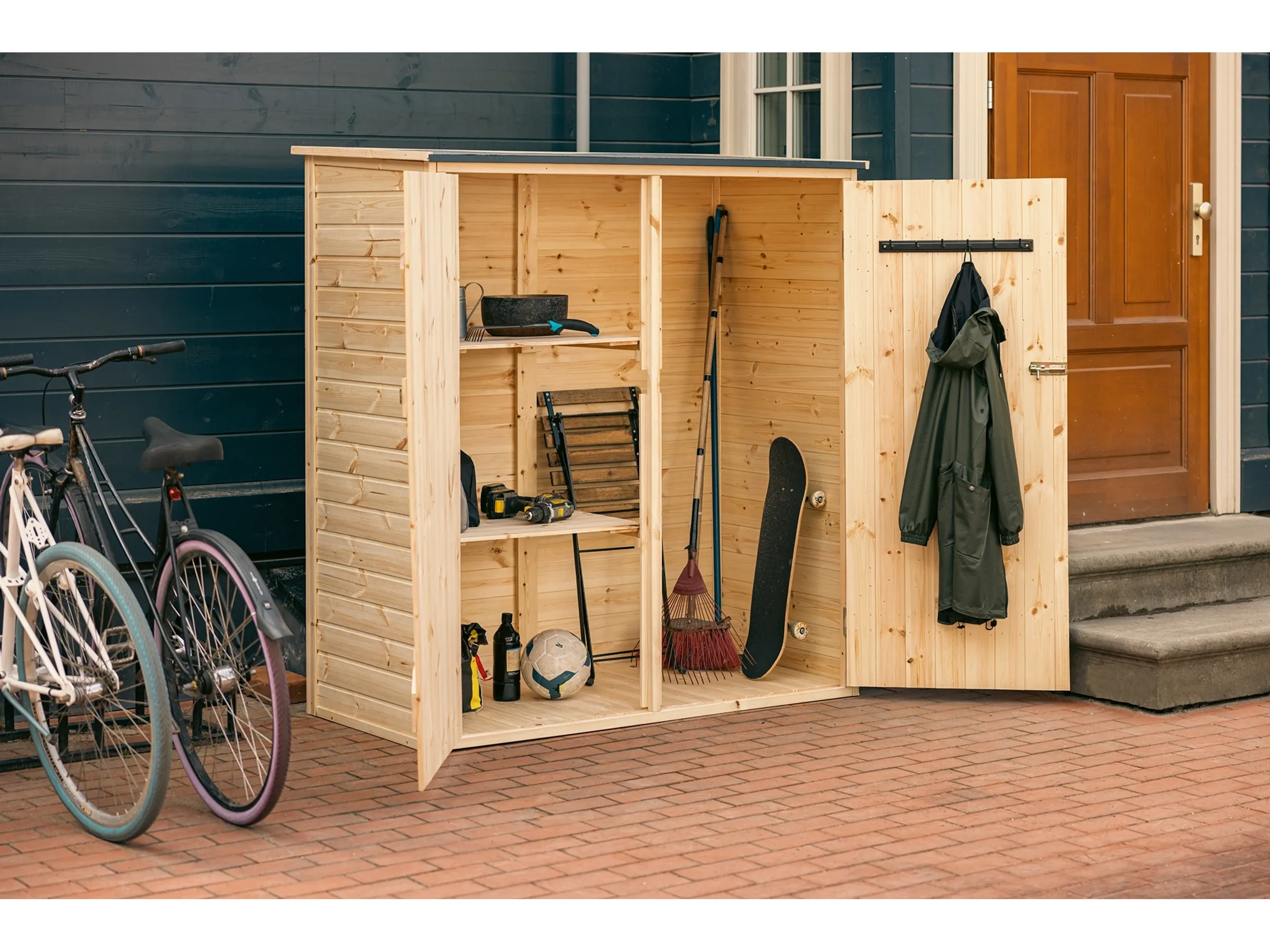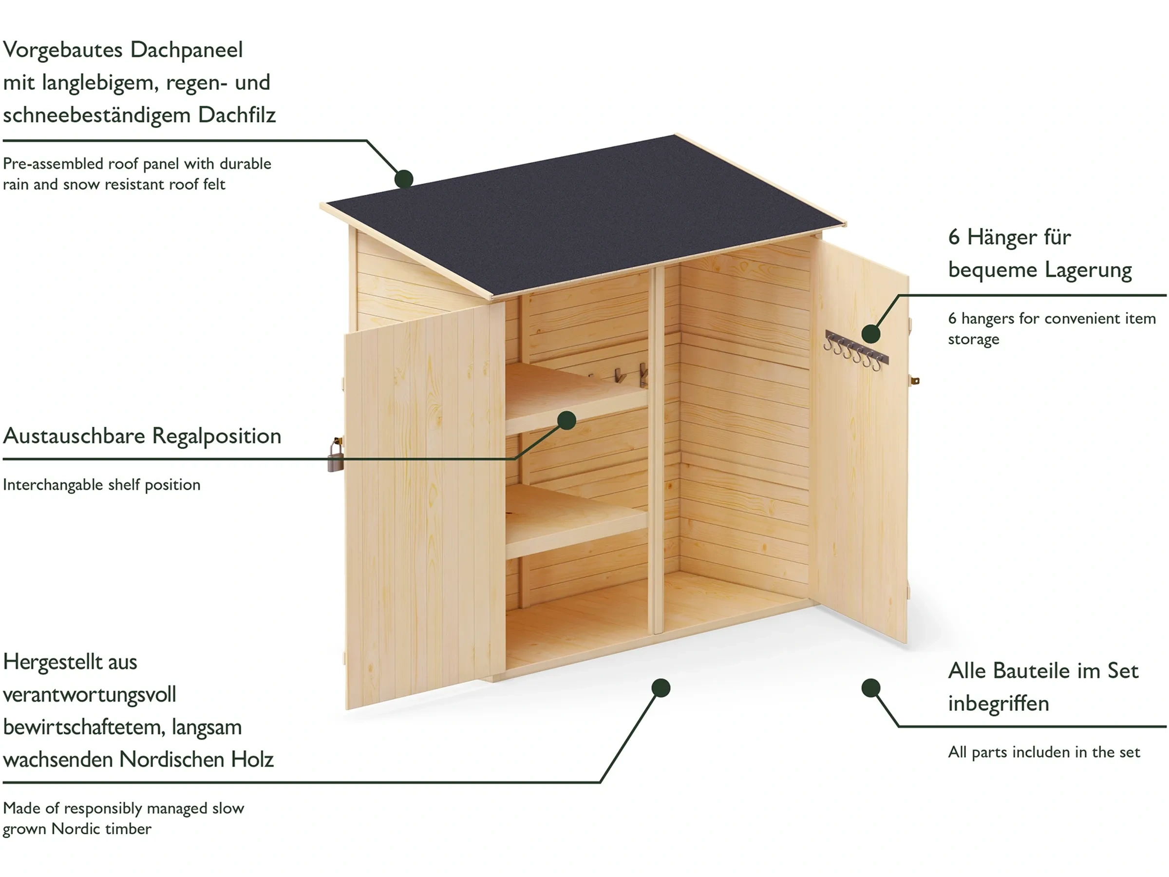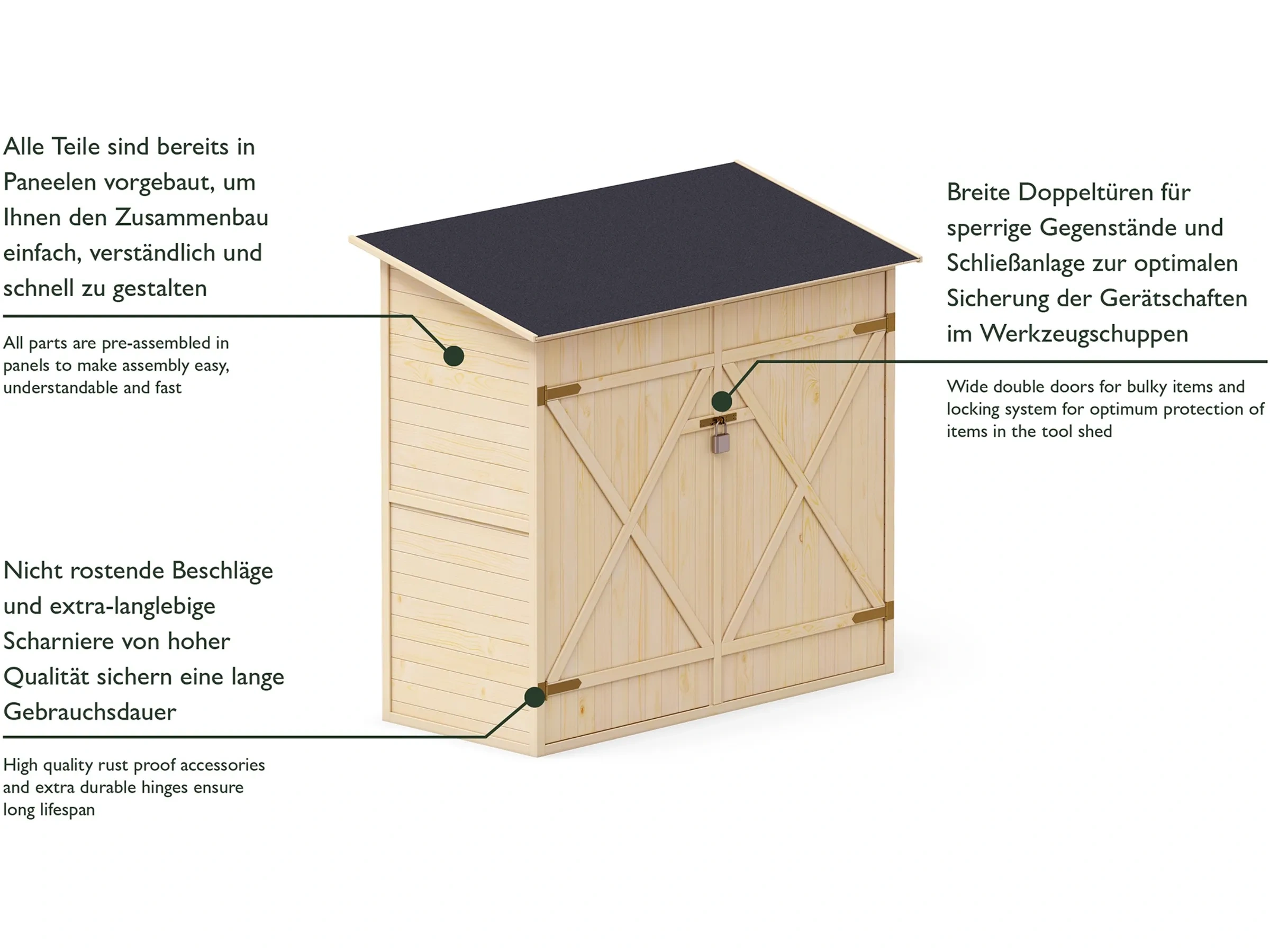 Highlights: Schneller Aufbau durch modulare Plattenkonstruktion, wetterfest und stabil, mit Regalsystem und Haken zur Organisation, abschließbare Doppeltüren, langlebig und pflegeleicht durch robuste Holzkonstruktion.