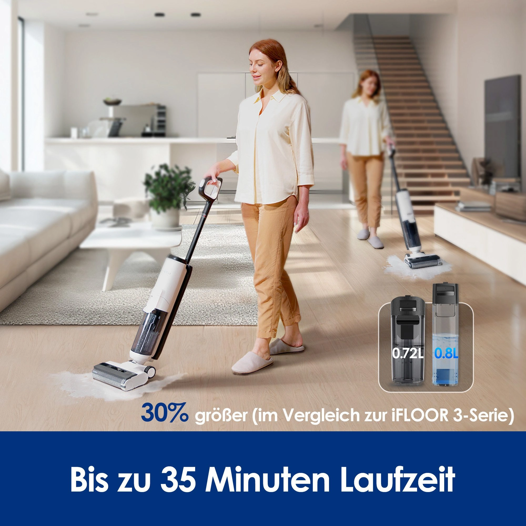 Das doppelte Tanksystem trennt Frisch- und Schmutzwasser zuverlässig, während die MHCBS-Technologie das verschmutzte Wasser über einen flachen Abstreifer direkt von der Walze abnimmt. So wird der Boden kontinuierlich mit sauberem Wasser gereinigt – ohne das typische Herumschieben von Schmutzwasser wie bei herkömmlichem Wischen. Ein 190-W-Motor, zwei Reinigungsmodi (Eco und Max) sowie ein leistungsstarker 4.000-mAh-Lithium-Ionen-Akku mit bis zu ca. 35 Minuten Laufzeit sorgen für starke Reinigungsergebnisse im Alltag. Nach dem Einsatz startet der iFLOOR 5 auf der Ladestation per Knopfdruck eine freihändige Selbstreinigung von Bürste und Innenkanälen.