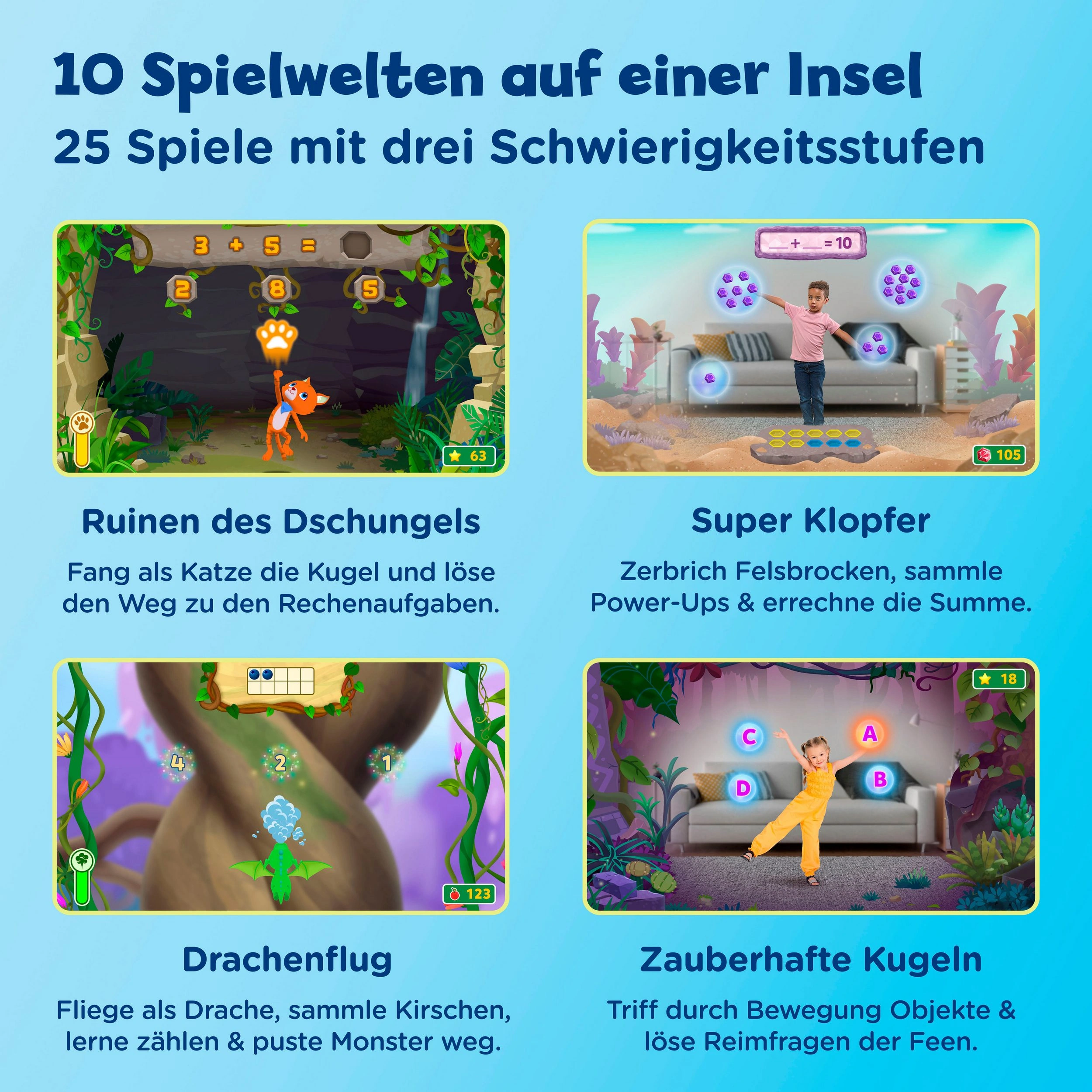 Highlights: Aktives Lernen mit dem ganzen Körper, adaptive Lernspiele mit wachsendem Schwierigkeitsgrad, Fokussierung auf Sprache, Mathe, Problemlösung und Motorik, integrierte Spielzeitkontrolle für kindgerechte Nutzung, kindgerechtes Design mit motivierenden Belohnungen und Abenteuern auf einer verzauberten Insel.